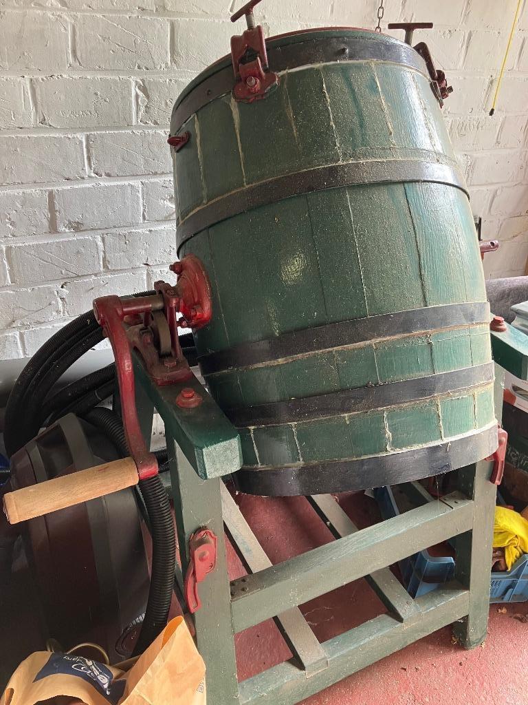 - Antieke boterton / kneedmachine op gietijzeren frameAntieke houten boterton / kneedmachine, gemonteerd in een zwaar gietijzeren frame met handaandrijving. Oorspronkelijk gebruikt voor het karnen of kneden (o.a. Boter, deeg of vergelijkbare toepassingenOphalen