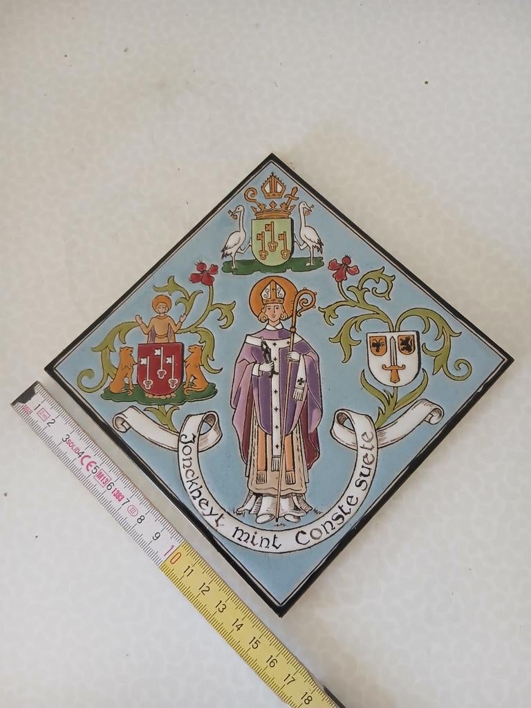 20 mrt 24HildeSchoten - Keramiek wapenschild van StokkemKeramische tegel van bree keramiek (gemerkt) met afbeelding van wapenschild van stokkem in reliëf. Afmeting 10 x 10 x 1,5 cm dik. Intact. Verzendkosten en risico voor koper.Ophalen of Verzenden