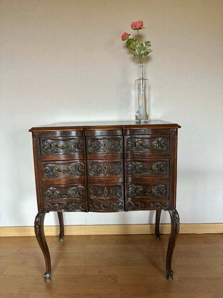 1 apr 26trhTremelo - Luikse commode of ladenkastMassief eikenhouten ladenkast met 3 laden met mooi snijwerk. Louis xv-stijl. 70/40 Cm en hoogte 80 cmOphalen