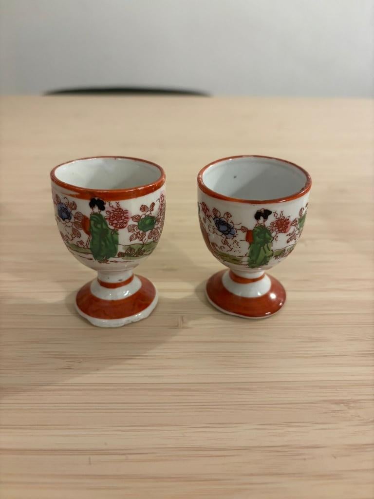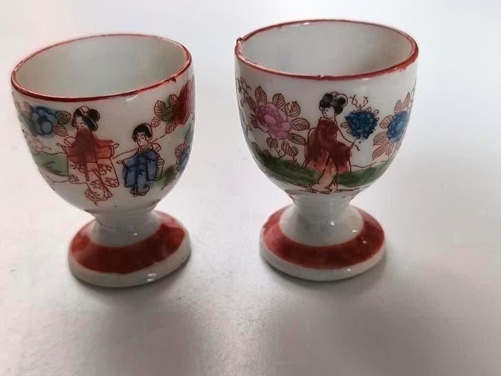 - 2 antieke Japanse eierdopjes2 prachtig gedecoreerde japanse porseleinen eierdopjes, hoogte 6 cm, verschillende figuren (o.a.geisha), verzendkosten en risico voor koperOphalen of Verzenden