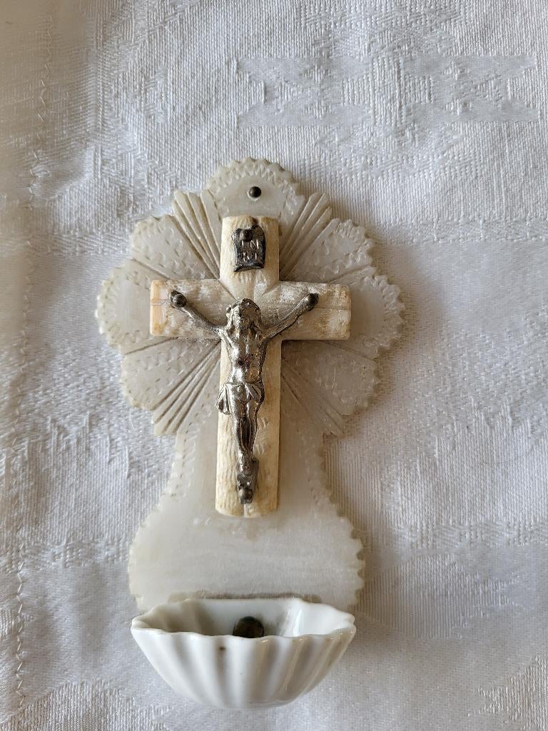 - Marmeren vintage wijwater bakjeVintage wijwater bakje van marmer en porselein. Gekruisigde jezus christus met de tekst inri. Het water reservoir is van porselein h 14 en b 8cm zie ook mijn andere wijwater bakjes. Bij afname meerderOphalen of Verzenden