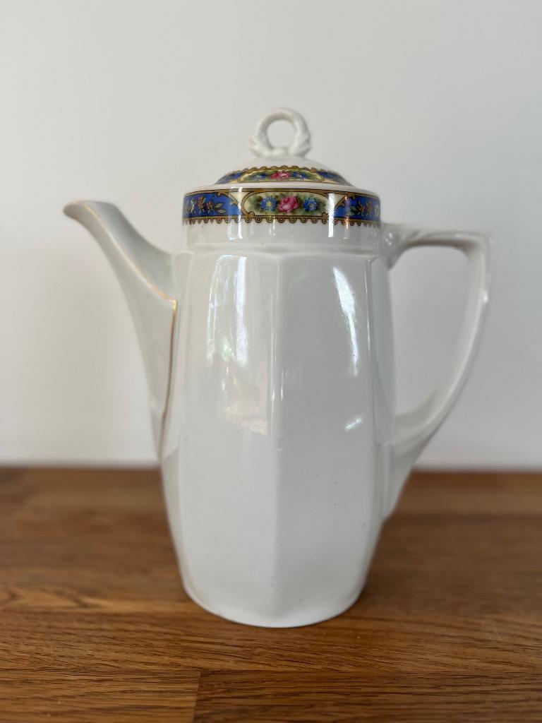 6 apr 26mietmangelschotsKessel-Lo - Vintage koffiekan porselein (1920–1930) – MPW MoschendorfMooie vintage porseleinen koffiekan met elegante vorm en decoratieve rand. Onderaan gemerkt met mpw (porzellanfabrik moschendorf, duitsland), daterend uit ca. 1920–1930. - Origineel vooroorlogs stuk -Ophalen