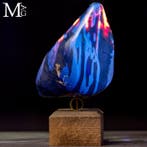 8 jun 25verf edArdooie - Prachtig exemplaar van Sumatra Blu Amber - UitzonderlijkSumatra blu amber-specimen op een gedraaide houten sokkel uit indonesië, gewicht 568 g, afmetingen 192 × 107 × 64 mm, met een buitengewone natuurlijke tekening en ambachtelijk hout- en messingwerk. Ti