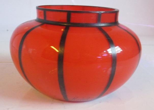 - art deco rood tango glas vaasje KolekHeel mooi art deco vaasje, met simpel strak geometrisch motief gesigneerd kolek austria goede staat hoogte 10 cm/ diameter 14 cm prijs overeen te komenVerzenden