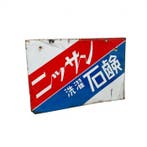 14 apr 2625609Glain & Partie Ans - Zeldzaam vintage Japans emaille reclamebord - Nissan ZeepOrigineel dubbelzijdig emaille reclamebord voor nissan zeep (nissan sekken), japan, emaille op staal, 36,5 × 55 cm, in goede staat met lichte ouderdomssporen en vlekjes. Een prachtig grafisch japans e