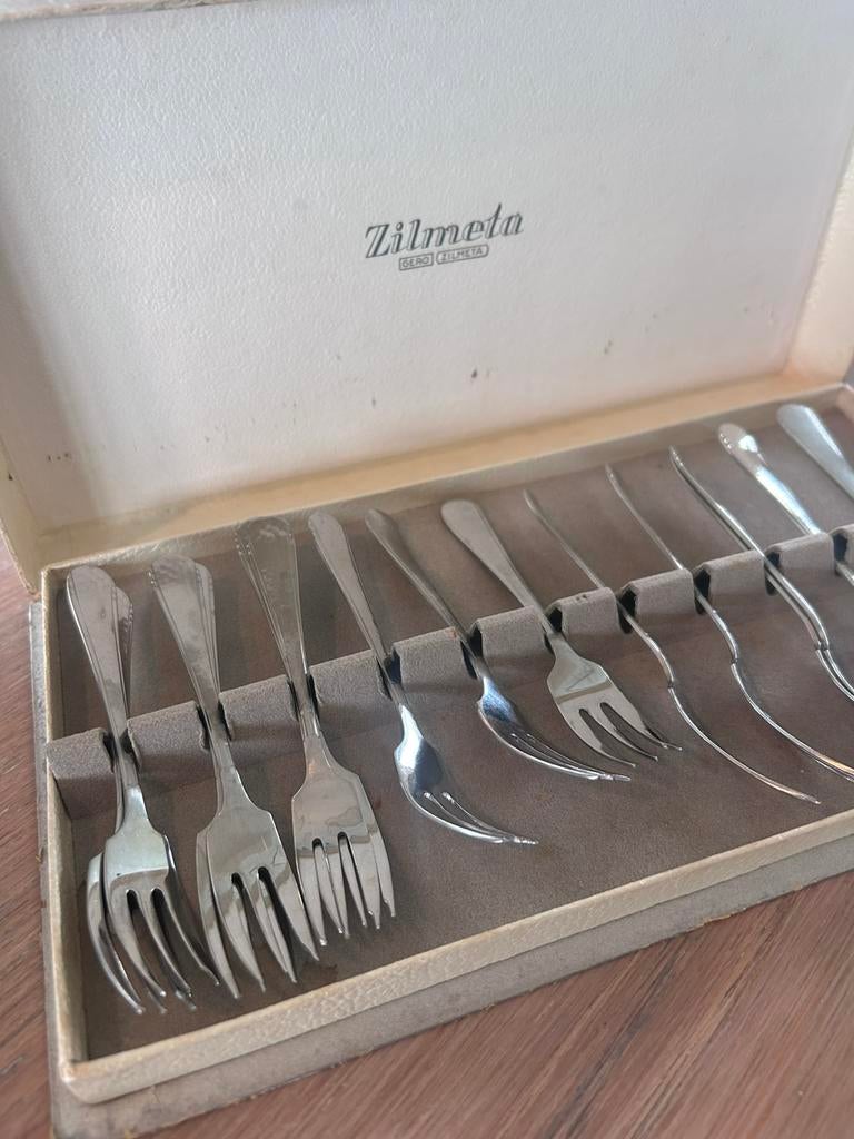 Authentiek Gero Zilmeta bestek is vaak te herkennen aan het specifieke ontwerp en de afwerkingskwaliteit. Op sommige stukken vind je ook het logo of de merknaam gegraveerd, wat een herkenningsteken is. Ook de gewichtbalans van het bestek is typisch, je merkt snel of het goed in de hand ligt en kwalitatief aanvoelt.