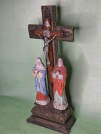 - Art Deco - Beeld, Antiek Calvariegroep Kruis - 40 cm - Hout,Antieke calvariegroep kruis, samengesteld object met houten kruis, metalen corpus en handbeschilderde porseleinen maria en johannes op een art deco voet, circa 1910, afmetingen 40 × 17 × 9 cm, ongesig