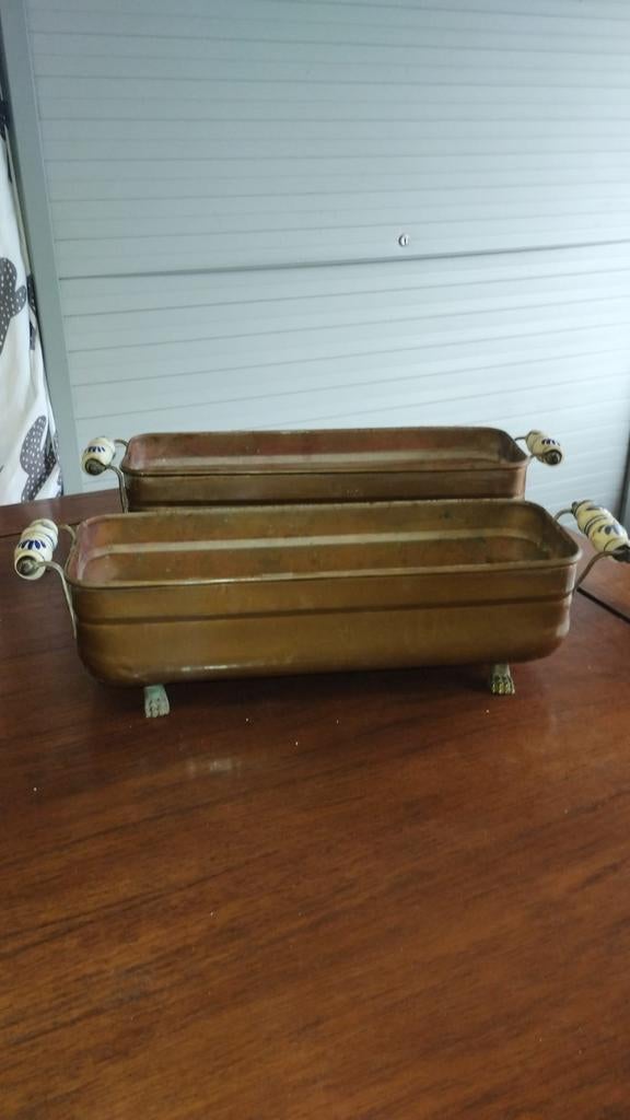 18 nov 25VINTIQ Vintage & AntiekPoperinge - Koperen bloembak / bloempot2 koperen bloembakjes in nieuwstaat. Rode bak is 20cm lang,10cm hoog en heeft stempel met handgemaakt onderaan. Gele bak is 17,5cm lang. Hoog 9,5cm.Ophalen of Verzenden