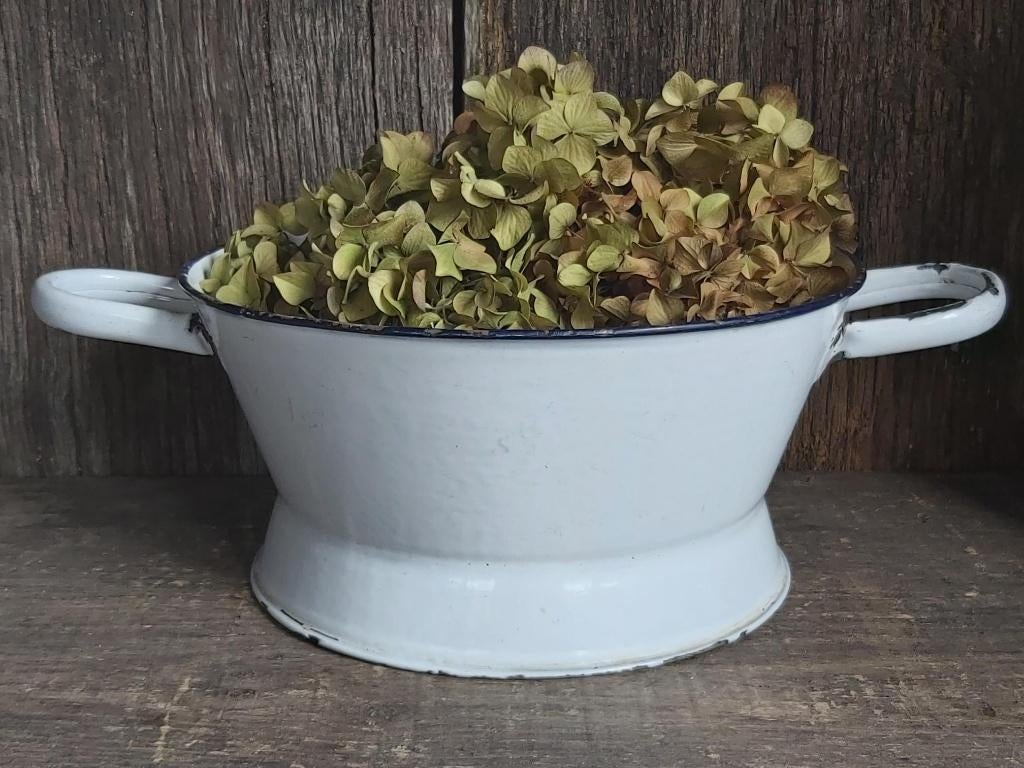 - Groot stevig oud wit email vergiet met blauw randjeGroot oud wit emaille vergiet met blauw randje leuk om vb te vullen met fruit, uien, kruiden ... .... Of aan je keukenrek te hangen afmetingen : 39cm van oor tot oor, doorsnede vergiet 27cm, hoogte 24Ophalen of Verzenden