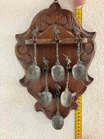 25 sep 25chris GBeringen - Lepel (7) - Eik - Lepelrek en tinnen lepelsVintage oud-hollandse lepelsrek uit 1950–1960, gemaakt van eikenhout met zeven objecten inclusief zes tinnen lepels, elk met ooievaarsfiguren en scheepsmotieven in de lepelschaal, hoogte 33 cm, breedt