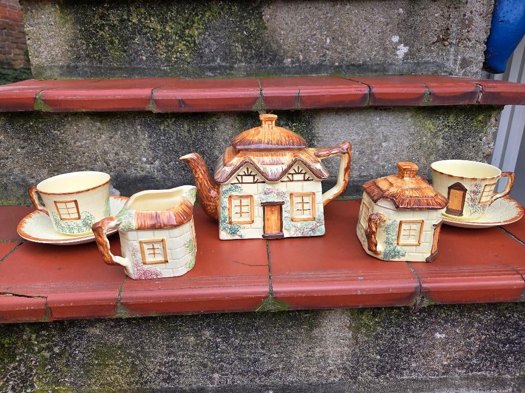 - Antiek Keele handgeschilderd Engels theeserviesVintage aardewerk theeservies van keele street (ksp), handbeschilderd, engelse cottage-stijl, uit staffordshire, engeland. Bestaat uit 2 kopjes met schotel suikertheepot en melkkannetje zeer oud handgOphalen