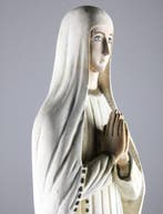 Antieke Onze Lieve Vrouw beelden zijn vaak gemaakt van hout, steen, of andere traditionele materialen. Ze hebben meestal gedetailleerde gezichtsuitdrukkingen en bijzondere kledij die typerend is voor de tijdsperiode waarin ze zijn gemaakt. Veel van deze beelden zijn geverfd of soms zelfs verguld, wat extra charme aan hun uitstraling toevoegt. Let ook op afwerkingen zoals slijtage of patina, die de ouderdom en geschiedenis van het stuk kunnen getuigen.