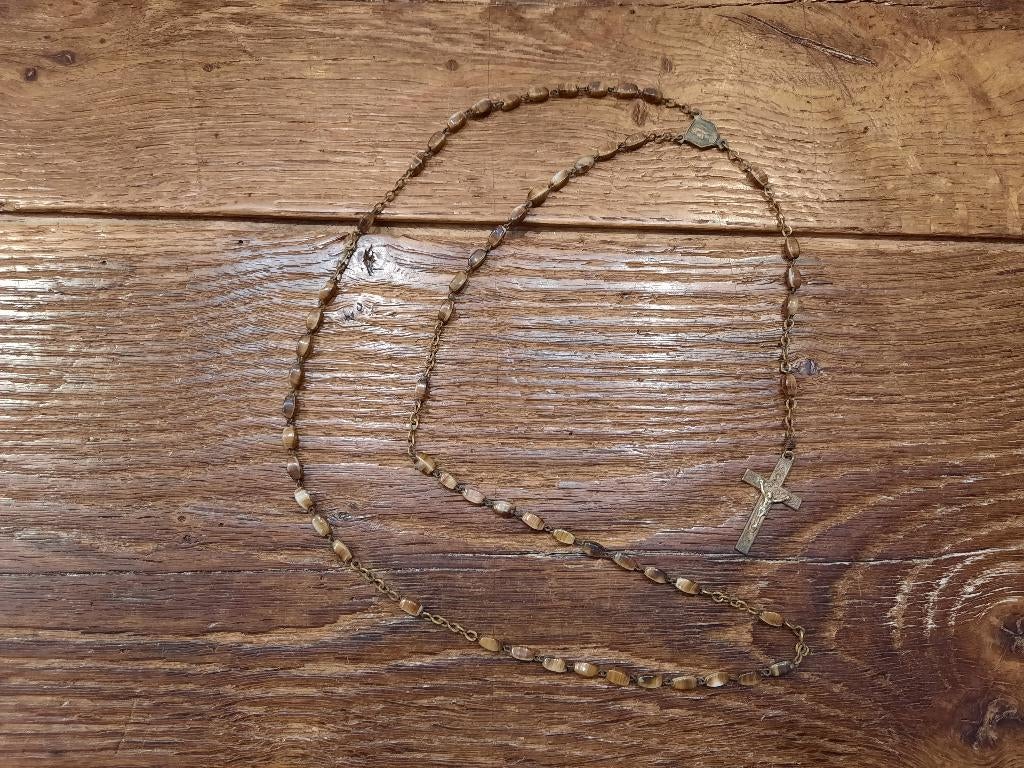 13 jan 26patrickBilzen - oude beige houten paternoster, begin 1900Oude beige houten paternoster begin 1900 de bolletjes zijn lang rond, met 6 ronde bolletjes tussen in metalen kruisje met christus zilveren medaillon tussen de bolletjes met aan de ene kant m andere kOphalen of Verzenden