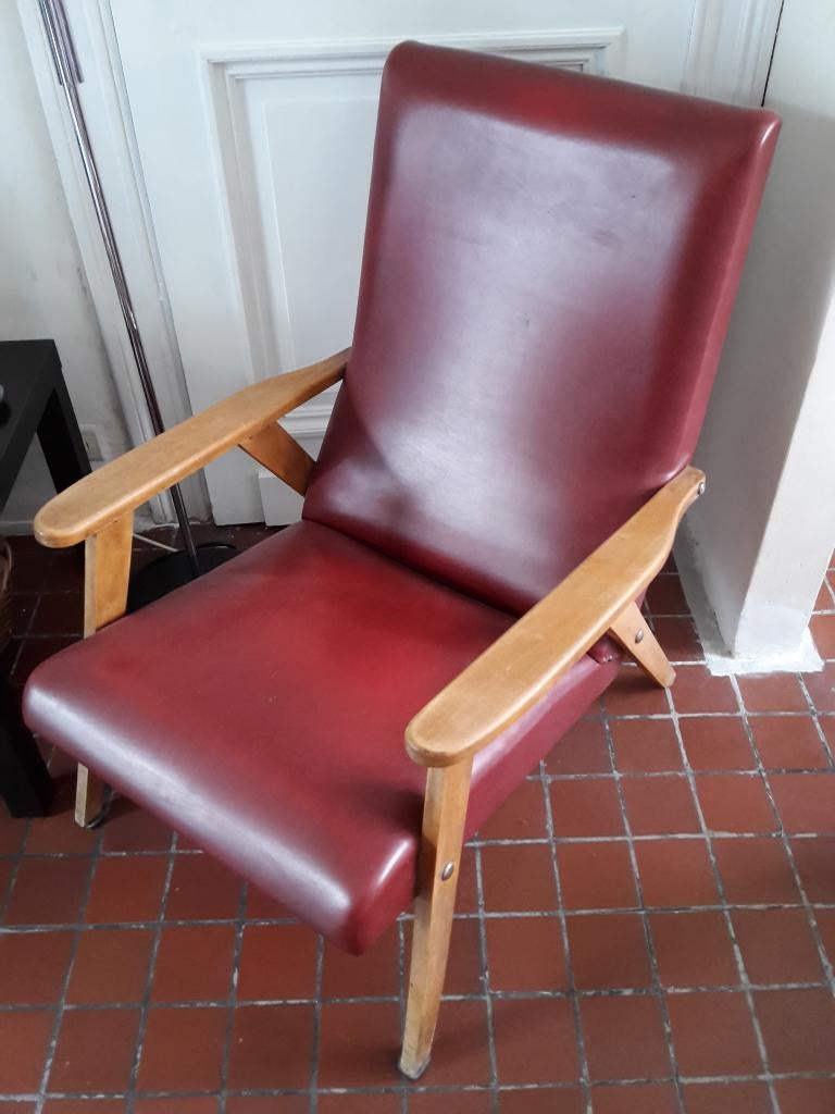 - Donkerrode vintage zetel, skai en hout, in prima staatMooie retro zetel, zit heel goed, maar past niet meer in mijn interieur. Vertoont lichte gebruikssporen.Ophalen