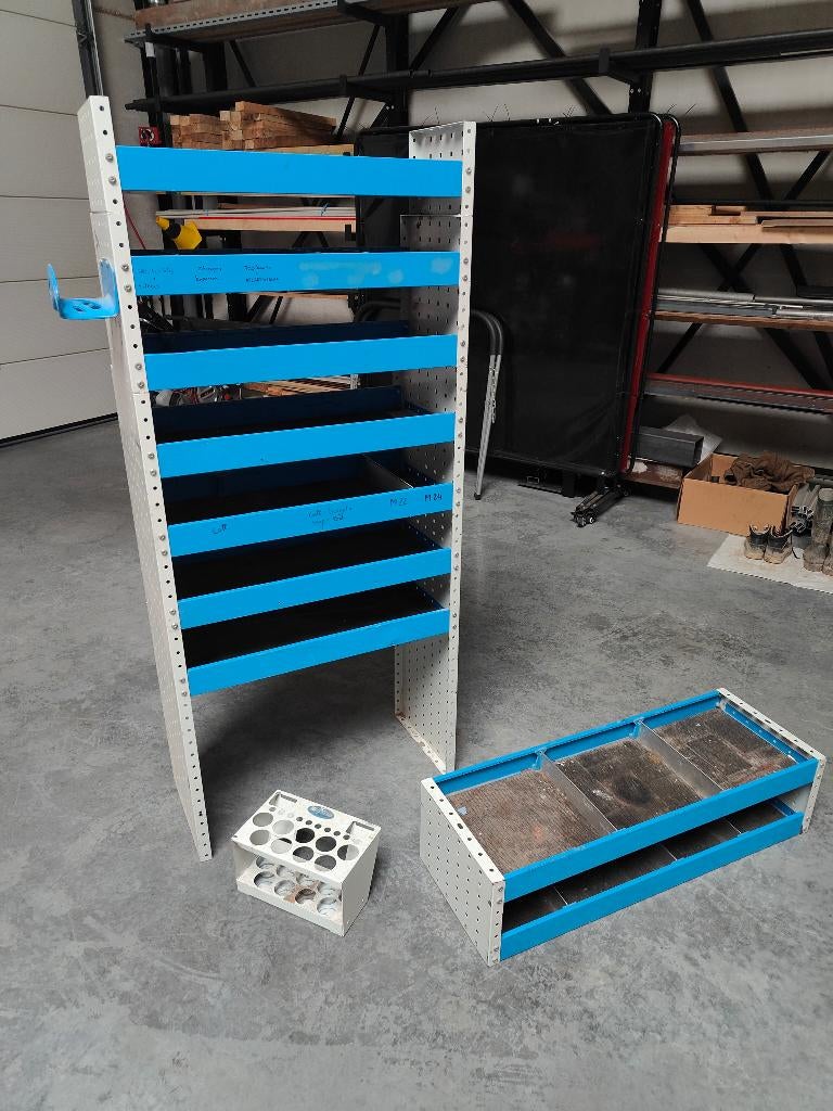 16 feb 26joorDesselgem - Bedrijfswageninrichting1/ werkbank: b=152 x h=99 x 36cm +10cm slanghouder 2/ sorteer vakjes: b=152 x h=114 x 36 (27) cm extra: onderaan 127 lang x 48 hoog verstelbare bakjes 3/ lades + sorteervakken: lades b=102 x 48 xGebruikt Ophalen