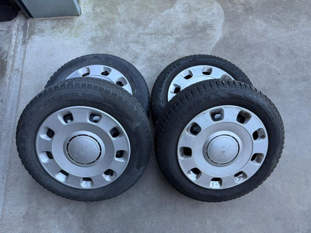 - Fiat 500 velgen + winterbanden 175 65 R14Stalen velgen afkomstig van fiat 500 met zeer goed profiel winterbanden 175 65 r14 82tGebruikt Ophalen