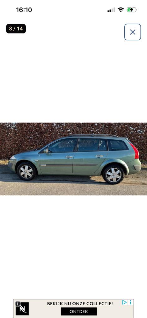 Hier bij verkoop ik mijn wagentje start rijd zonder problemen renault megane diesel 1.5 2004 173200 Km de 2 ruiten van voor r-l gaan niet open en de dak hemel doek staat los en gescheurd
