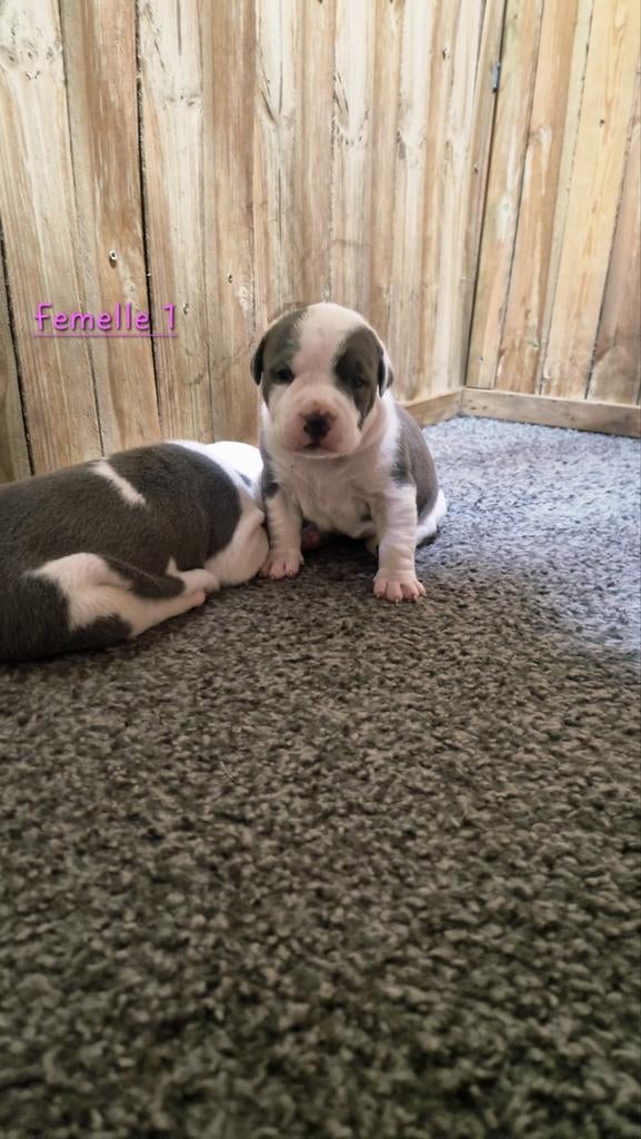 - American staffordshire terrier (Chiot)Bonjour, nous sommes un élevage familial agrée passionnés par la race amstaff, d'après un bon et long repos de notre princesse sasha à mis au monde 5 magnifiques chiots (3 f. Et 2 m.) De couleur b