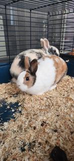 2 konijnen ter adoptie. Ze zijn zindelijk en doen alles in de toiletbak. Het mannetje (gecastreerd) en het vrouwtje mogen samen weg met hun kooi en de