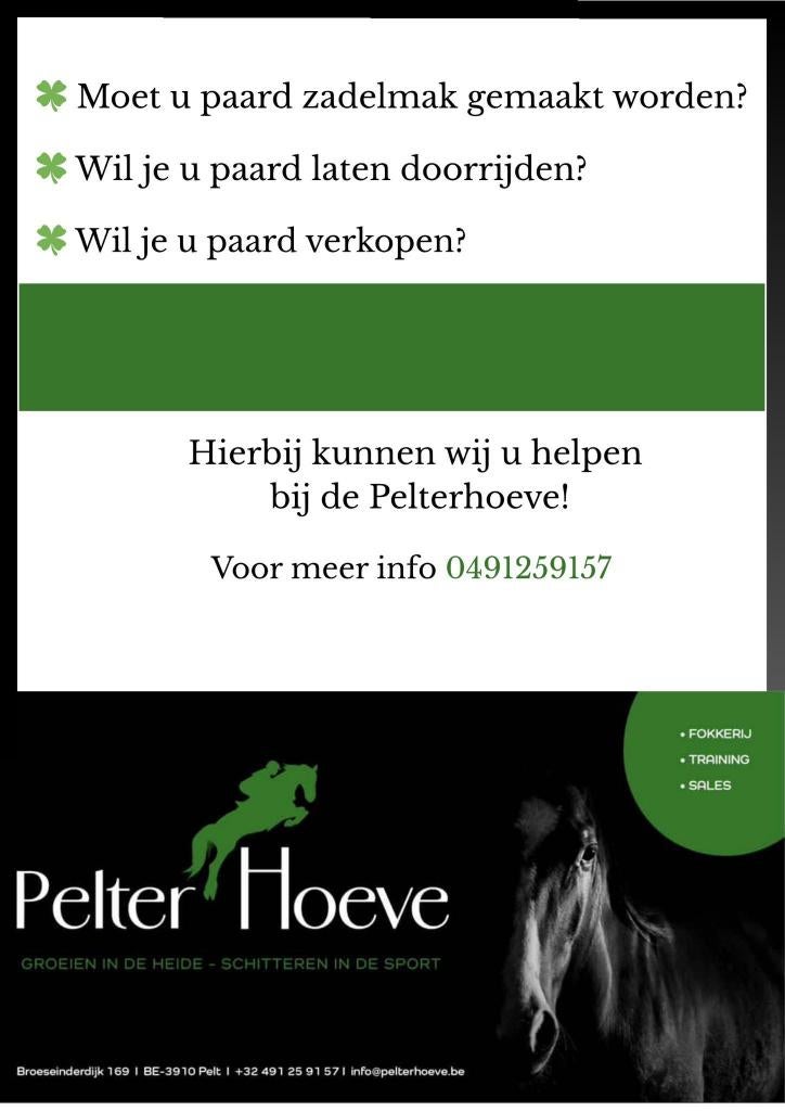 21 apr 26Charlotte - EvoluteDiest - Trainen,zadelmak maken,doorrijden van paarden en pony'sErvaren springruiter met meer dan 30 jaar wedstrijdervaring ,eigen stalling en piste paarden/pony's zadelmak maken -uitbrengen op wedstrijd -opleiden , trainen en wedstrijdklaar maken. Ook paarden