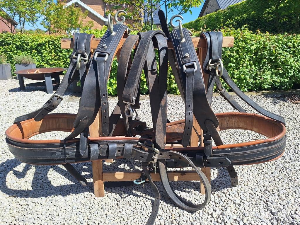 - Dubbelspan tuig in goede staatDubbelspan tuig in goede staat maat full (lag op friezen), bestaat uit borsttuig met strengen + schofttuig (zonder rugriem/broek en zonder hoofdstel)Ophalen