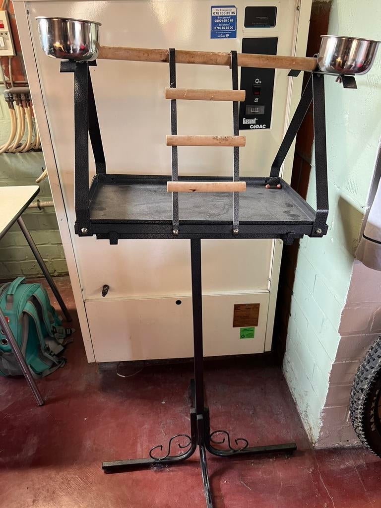 22 mrt 26sMerksem - Staander voor papegaai, T-standMetalen staander met houten zitstok. Ideaal voor het geven van een douche. De stok schommelt een beetje bij gebruik. Onze papegaai lijkt dat aangenaam te vinden. 😉 Hoogte 124 cm breedte stok 46 cm hi