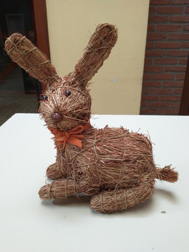 - Strooien paashaas- Paashaas in stro met gele strik.Strooien paashaas- paashaas in stro met gele strik in perfecte staat. Hoogte ongeveer 42 cm.Ophalen
