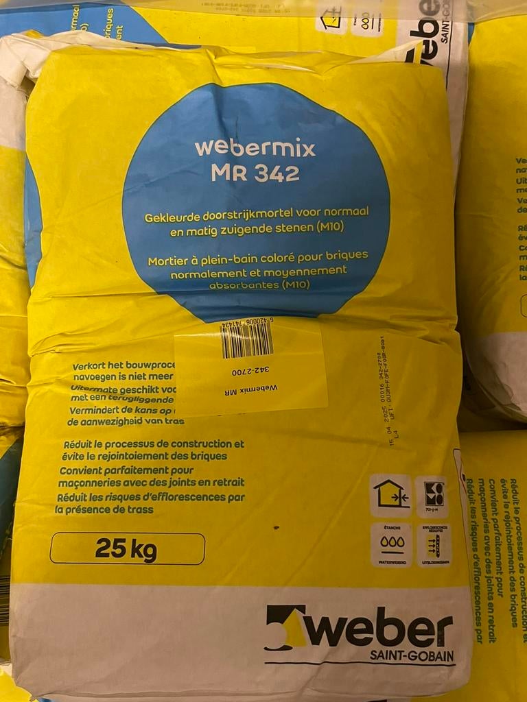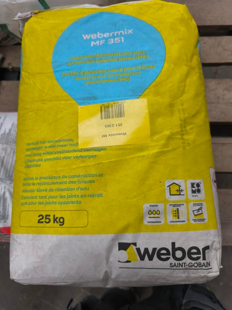 - 40x25kg webermix mf 351 kleur 200040 zakken dunbedmortel , kleur 2000 (wit-lichtgrijs). Liggen droog. Als pakket of per zak. 15 Eur per zak foto in combinatie met imperium flaviusOphalen