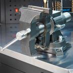 Om een grote bankschroef veilig aan je werkbank te bevestigen, begin je met het kiezen van een geschikte locatie die voldoende ruimte en stabiliteit biedt. Zorg ervoor dat de werkbank stevig is en niet wiebelt. Gebruik de bevestigingsschroeven van de bankschroef om deze te bevestigen, maar boor eerst gaten voor om splijten van het hout te voorkomen. Draai de schroeven goed aan, maar overdrijf niet zodat je de werkbank niet beschadigt.