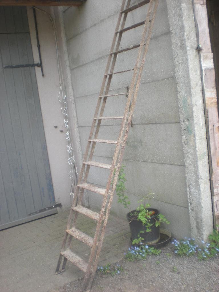 GisterenBettyMerelbeke+Deel Zwijnaarde - ijzer trapZeer stevige zware (40 kg) ijzeren trap moet afgeschuurd worden en nieuwe verflaag (of juist niet - is mooi als decoratie) h 280 cm - 13 treden - br trede 45 cm - diepte 9 cm - geen leuningOphalen
