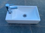6 feb 26YverstOostkamp - Kleine wastafel, toilet, wastafel, keramiek, L49cm, l21,5 cmAfmetingen: hoogte 15 cm, breedte (diepte) 21,5 cm, lengte 49 cm. Materiaal: keramiek soort spoelbak: wastafel kleurbereik: wit model: wit model: fontein aantal kraangaten: 2 overloop: met een enkel gGebruikt Ophalen