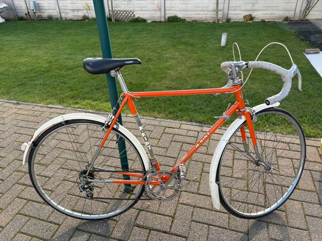 15 mrt 26NormanLebbeke - herenfiets M KINTRetro toeristenfiets van marcel kint begin jaren '70, al zeldzaam, 7 versnellingen, rijklaar, heel licht stalen kader, vrij liggende fietshouding door sportstuur. Het merk bestaat nog en maakt nuGebruikt Ophalen