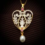 7 apr 26CatawikiHeel België - Collier - 14 carats Or jaune - Diamant - RobijnCollier vintage en or jaune avec un motif central orné de deux rubis ovales et de trois diamants taillés brillant dans une monture or blanc et jaune, 14 carats, poids total 6,08 g, longueur env. 40 CmNieuw