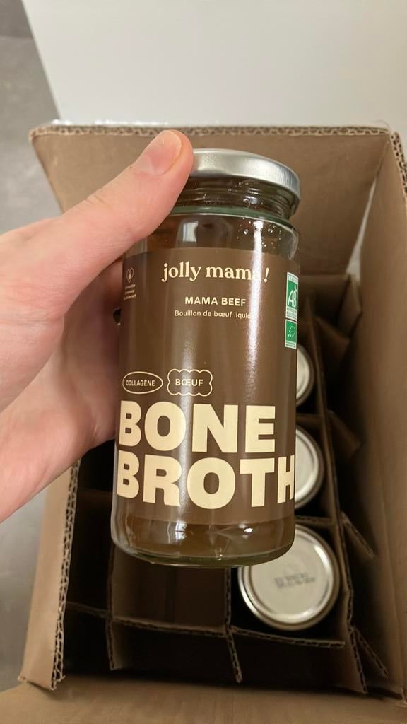VandaagTopzoekertjeBENBrussel - Bone broth Joly Mama (boeuf) et Atelier Nubio (poulet)2 boîtes de 6 bone broths. Neufs. Je les vends car mon alimentation est restreinte et je ne peux plus les boire. 30€/boîte.Nieuw Ophalen
