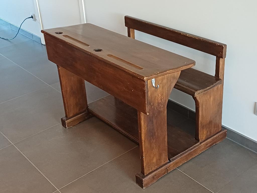 VandaagMaéva BussardIxelles - Houten schoolbankHouten schoolbank zoals vroeger, 2 personen, een vak onder de bank om papieren in te steken, met rugsteun, heel stevig, met kapstok aan de zijkant, nog volledig in orde buiten hier en daar een paar krGebruikt Ophalen