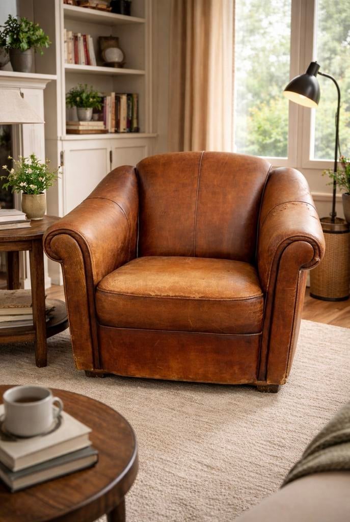 10 feb 26EizeMortsel - Vintage clubfauteuil in cognac leer — jaren 60Prachtige vintage clubstoel in echt cognackleurig leer, waarschijnlijk uit de jaren 60. Zeer comfortabele fauteuil met een prachtige natuurlijke lederen patina die hem veel karakter geeft. Ideaal voorGebruikt Ophalen