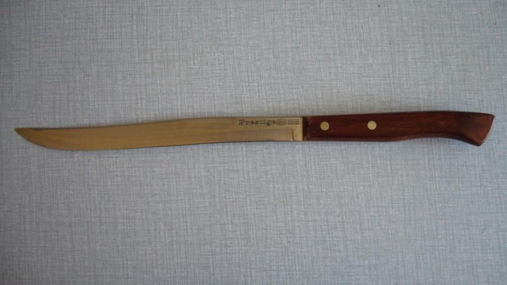 - KEUKENMES (VOOR HAM)Keukenmes (voor ham) merk prestige vanadium roestvrij staal, gemaakt in engeland; totale lengte 34 cm, lemmet van 205 x 18 mm; ergonomisch houten handvat. Heel scherp. Zo goed als nieuw.Zo goed als nieuw Ophalen