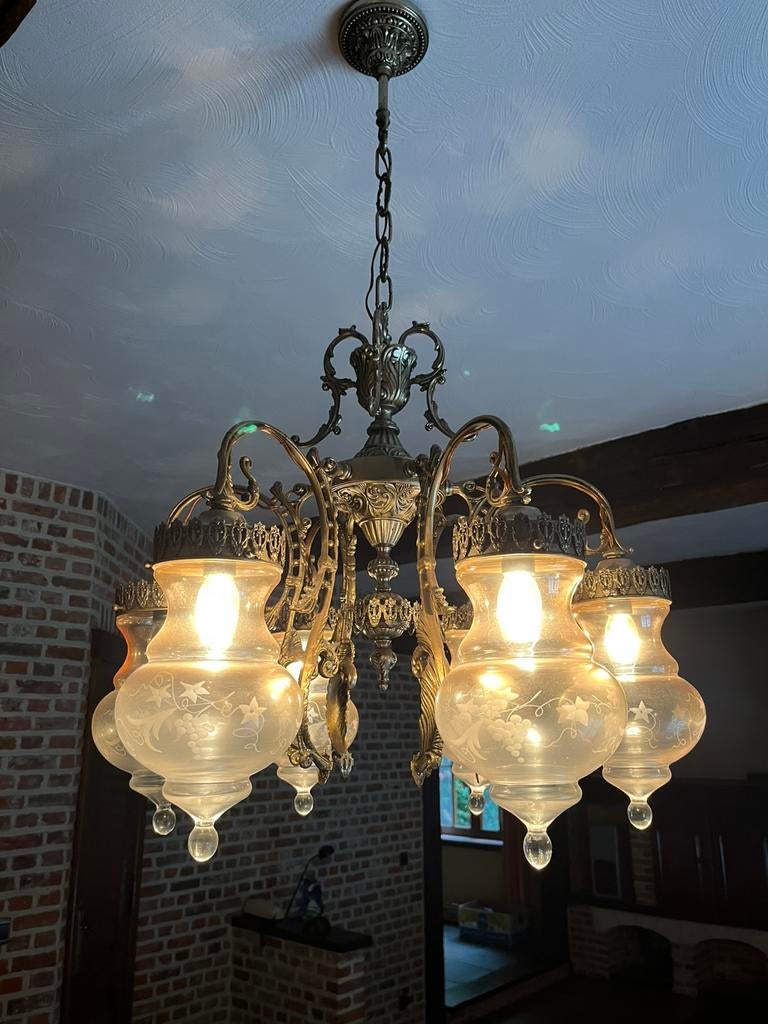 VandaagvidaXLHeel België - Messing kroonluchter met glazen bloemkappenMooie grote messing kroonluchter met 10 glazen bloemkappen, volledig origineel en compleet. Alle bloemkappen zijn aanwezig en onbeschadigd. ✅ Massief messing ✅ 10 lichtpunten (zeldzamer model) ✅ glazeZo goed als nieuw Ophalen