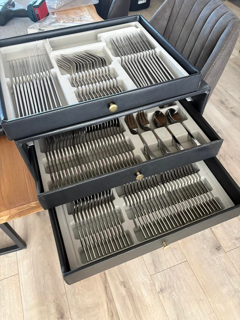 Wat deze bestekkoffer uniek maakt, is de combinatie van functionaliteit en stijl. De aandacht voor detail in het ontwerp en de hoogwaardige afwerking zorgen ervoor dat het niet alleen praktisch is, maar ook een aanvulling vormt op je eetervaring. Elke set is met zorg samengesteld om een perfecte balans tussen gebruiksgemak en esthetiek te bieden.