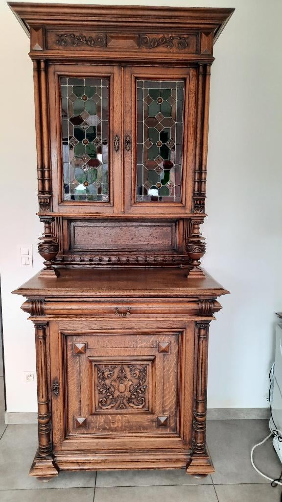 17 apr 26FerdinandTholen, NL - 19e-eeuwse antieke Mechelse kastAntieke mechelse kast - 19e-eeuws, renaissancestijl houtsnijwerk - glas-in-lood 2 delen 2,45m x 1,25m x 60 cm in zeer mooie staatOphalen