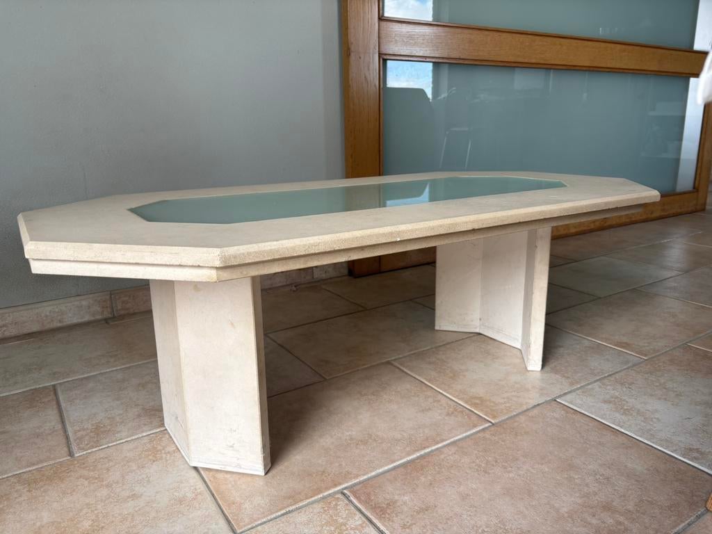 Travertin is redelijk eenvoudig te onderhouden, maar het vereist wel wat aandacht. Het is belangrijk om gemorste vloeistoffen direct op te ruimen om vlekken te voorkomen, omdat travertin een poreuze steen is. Voor het schoonmaken kun je het beste een zachte doek en milde zeep gebruiken. Vermijd agressieve schoonmaakmiddelen die de steen kunnen aantasten. Verder kun je overwegen om je tafel regelmatig te impregneren voor extra bescherming.