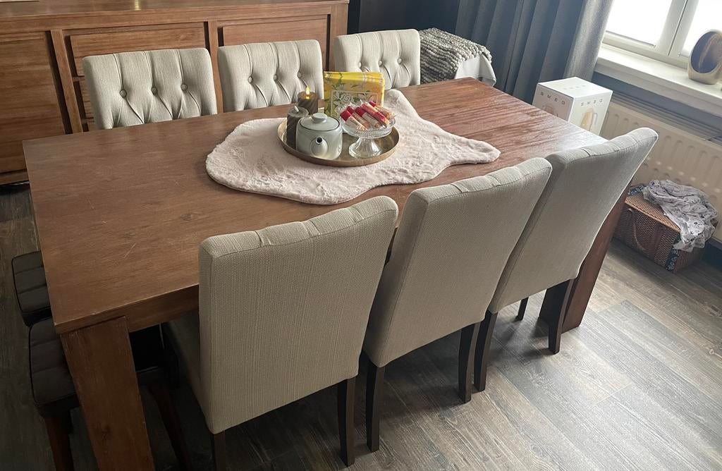 20 feb 26IlaraNinove - Prachtige houten tafel en 6 stoelenHierbij verkoop ik deze prachtige houten tafel met prachtige stoelen zo goed als nieuw. Afmeting tafel:lengte 1,80cm, breedte 90cm,hoogte 80cm. Afmeting stoelen: hoogte 97cm, lengte 42cm, diepte 53cm.Zo goed als nieuw Ophalen