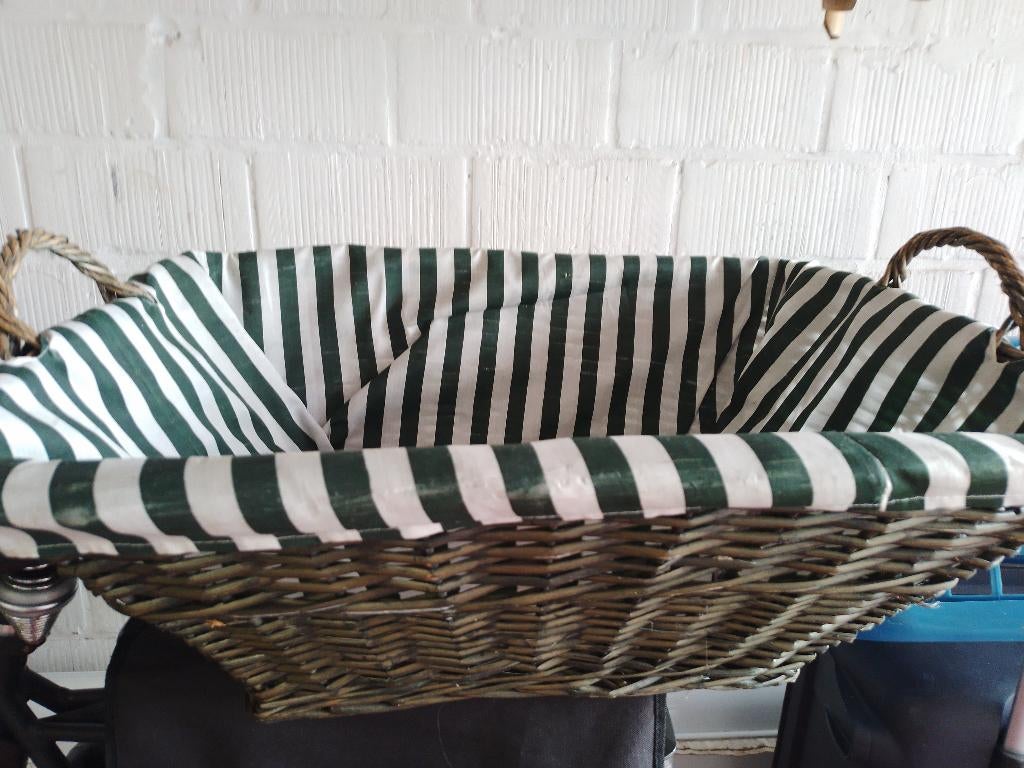- Grote Rieten manden bekleed 2 stuks als nieuwTwee grote rieten manden gevoerd van heel goede kwaliteit. De bekleding kan er uit om te wassen. Foto afm. B.65 D. 50 H. 25 Prijzen 20 euro per stuk. Met groene streep foto afm. B. 60 D. 45 H. 25 PrijNieuw Ophalen