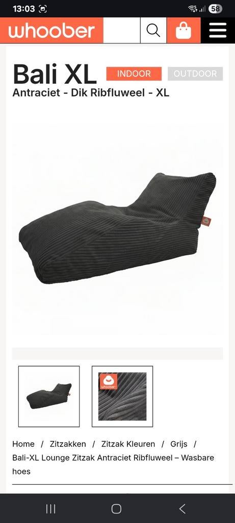 - Whoober zitzak Bali XLZitzak in grijs ribfluweel goede staat extra zak met opvulling erbij afhalen in meise nieuwprijs €219Ophalen