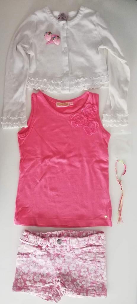 - Vijfdelig setje Monnalisa en Someone maat 110Vijfdelig setje in maat 110: wit vestje met franjes van monnalisa (met reserveknoop), roze topje met bloemapplicatie van someone, short met bloemenprint, armbandje van someone en twee haarspeldjes (aaGebruikt Ophalen of Verzenden