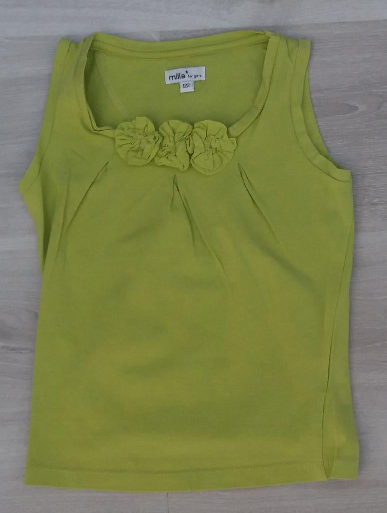 GisterenleenHerdersem - T-shirt JBC,maat 122Groen t-shirt van milla,aan de hals afgewerkt met bloemen. Materiaal: 95% katoen,5% elastaanZo goed als nieuw Ophalen of Verzenden