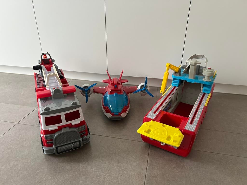 30 mrt 26JillKapellen - Paw Patrol: set van 3 grote voertuigenSet van 3 paw patrol voertuigen: boot, brandweerwagen en vliegtuig. Met licht en geluid. De voertuigen zijn ook apart te verkrijgen. Prijs is dan nog overeen te komen.Gebruikt Ophalen