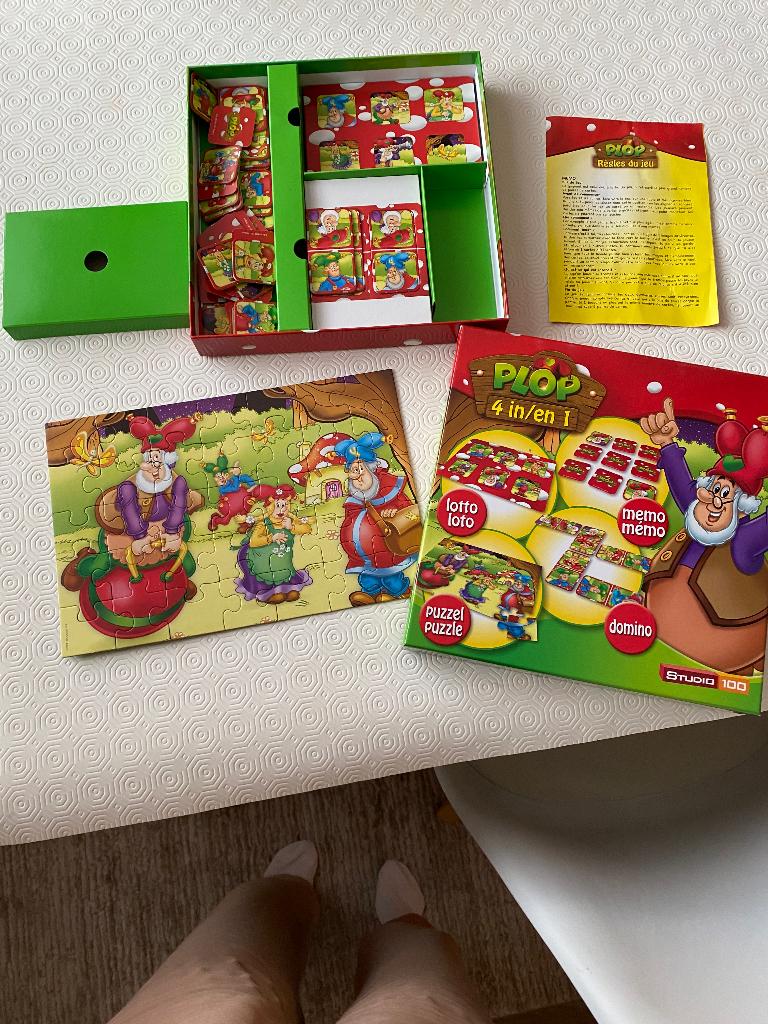 2 apr 23AnnHerzele - Plop 4 in 1Doos bevat 4 spelletjes: -memospel met 48 kaartjes -lotto met 4 kaarten -domino met 28 kaarten -puzzel van 35 stukken perfect in orde!Zo goed als nieuw Ophalen of Verzenden