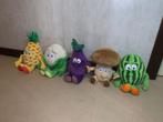 Knuffels vitaminis, in nieuwstaat, ook apart te koop; aubergine, ananas, knolselder, knoflook, peer.