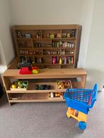 - Winkeltje met inhoud, Smoby kassa en winkelkar1m25 breed. Achterwand 1m20 hoog. Toog 60cm hoog. Kassa smoby( micro hangt beetje los)Gebruikt Ophalen